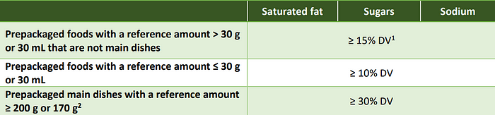 For most prepackaged products, a symbol must appear on the label when the amount of saturated fat, sugars, and/or sodium is ≥ (equal to or greater than) 15% of the applicable DV, with a few exceptions listed below: