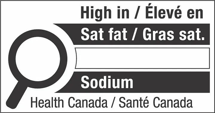 As of January 1, 2026, all prepacked food products entering the Canadian market should comply with the new front-of-pack nutrition labeling rules, bearing a logo similar to the following one anytime they are considered high in saturated fats, sugars, and/or sodium: